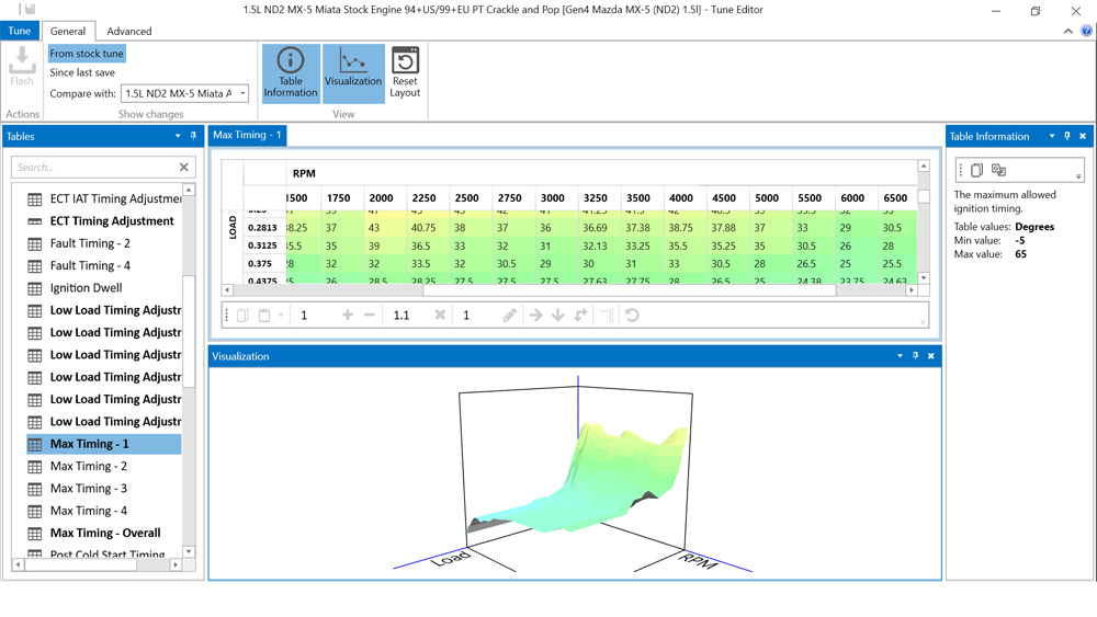 The OTS tune I provided to VersaTuner is a 'no frills' version to give the user a taster of what is possible from the software, and although it does offer maximum power and torque, a custom tune gives access to hundreds of other calibration tables.